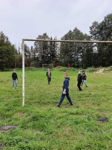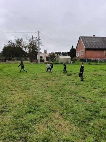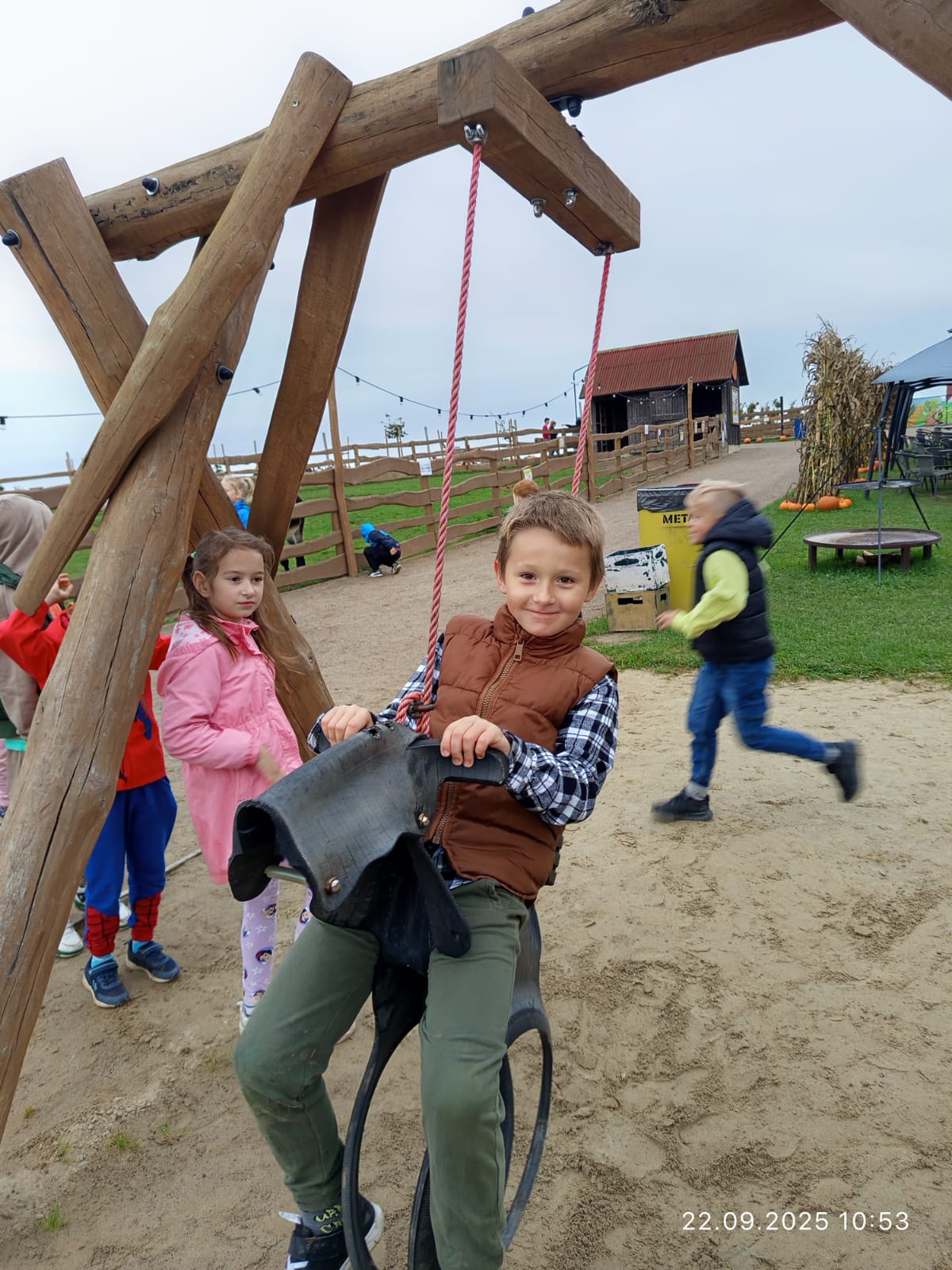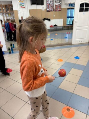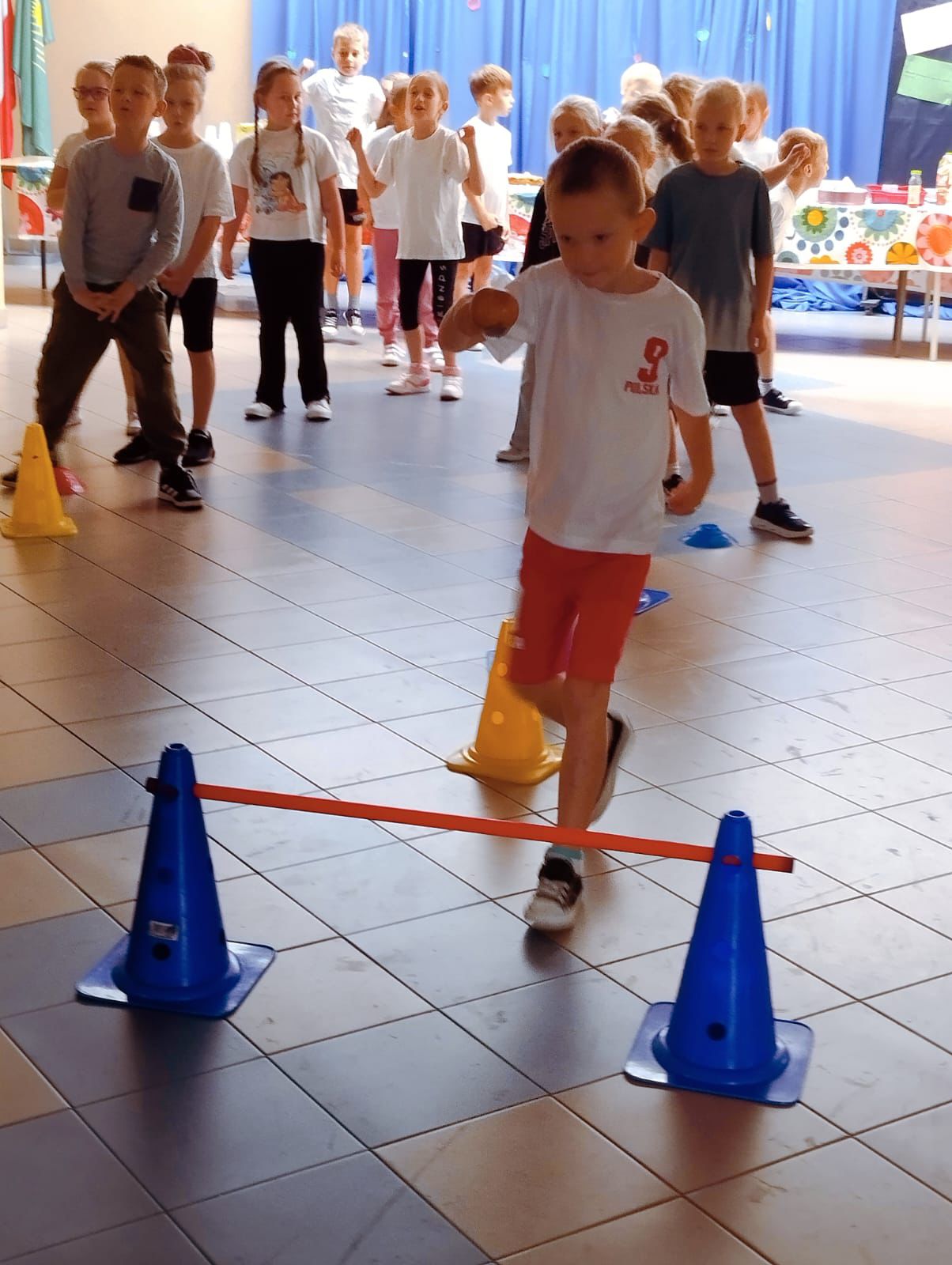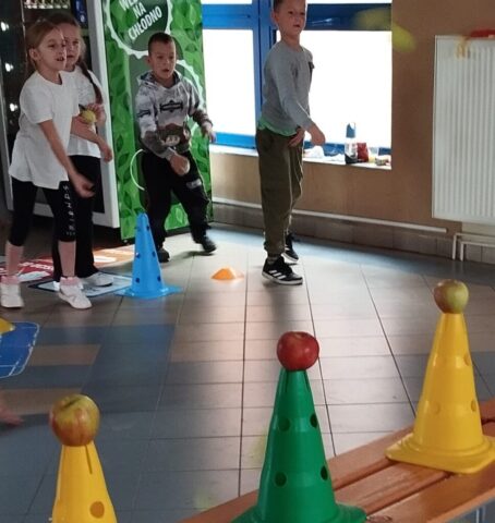 Uczniowie klas 1–3 wzięli udział w terenowych zabawach, takich jak poszukiwanie ukrytych jabłek i inne aktywności ruchowe, które sprawiły im wiele radości.